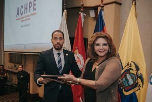 La Lcda. Pollyanna Gómez, Representante de los Centros Especializados de Diálisis en el Directorio de la Asociación entrega la placa de reconocimiento de ACHPE aI Ing. William Marriott de la Fundación Renal Íñigo Álvarez de Toledo del Ecuador, en sus 25 años de vida institucional.