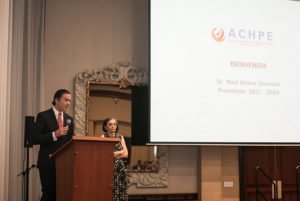 Sr. Raúl Alcívar. Presidente de ACHPE, Director General del Hospital Alcívar y Gerente de DIALCÍVAR de Guayaquil da la bienvenida a los miembros de ACHPE a la Asamblea General de la Asociación.