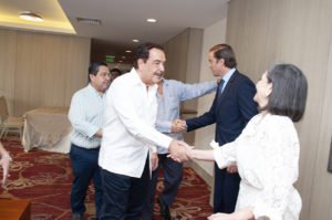 Abg. Jaime Nebot Saadi, Alcalde de Guayaquil saludando a Econ. Ana Delgado. Directora Ejecutiva de ACHPE. Sr. Raúl Alcívar. y al Presidente de ACHPE, Director General del Hospital Alcívar y Gerente de DIALCÍVAR de Guayaquil.