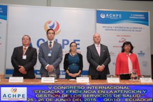 Sr. Raúl Alcívar, Presidente de ACHPE; Dra. Verónica Espinoza, Subsecretaria de Gobernanza de la Salud, Dr. Alfredo Borrero Vega, Decano General de la Facultad de Ciencias de la Salud de la Universidad de las Américas; Dra. Gina Tambini, Representante de OPS/OMS en Ecuador.